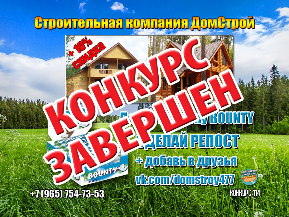 Разыгрывает коробку BOUNTY + скидку 10% на дома (на фото ниже)