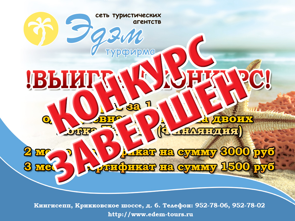 Сеть туристических агентств «Эдэм» при информационной поддержке портала Кингисепп-сегодня.рф проводит розыгрыш!