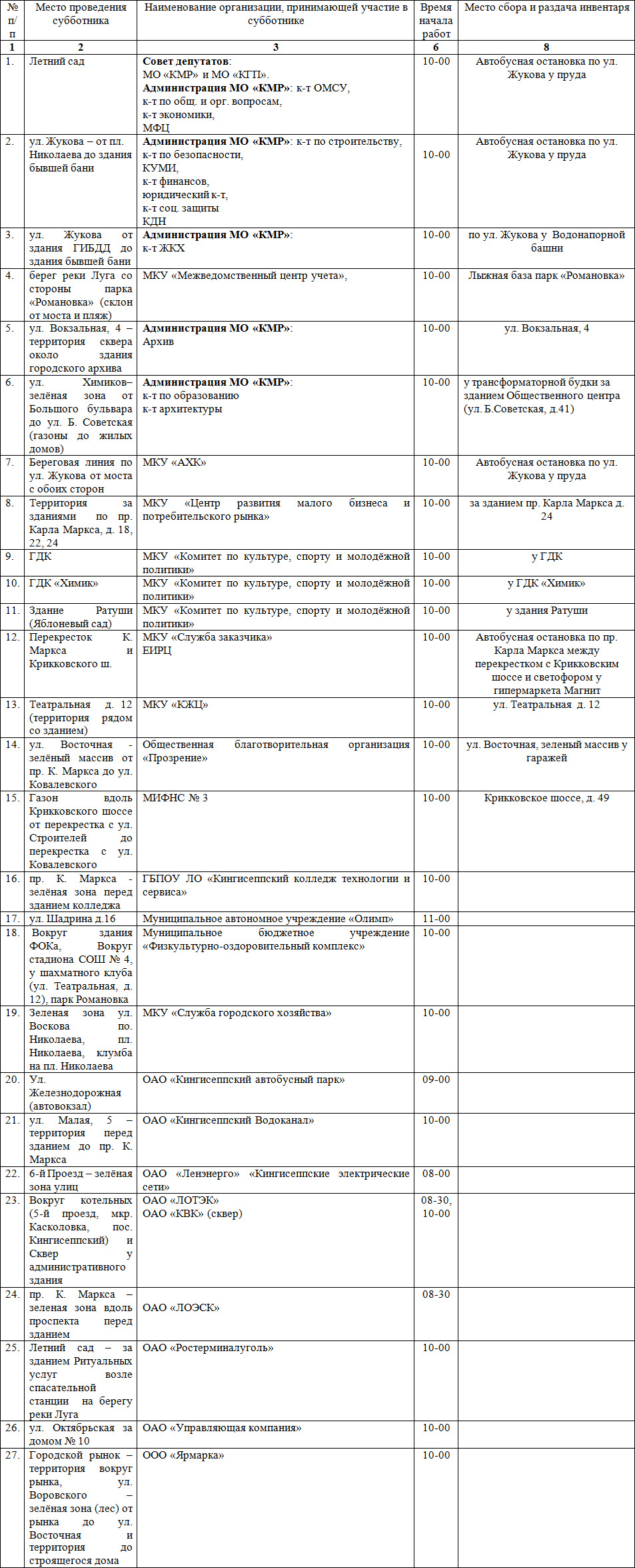 Кингисеппские предприятия, учреждения и организации принимающие участие в субботнике.