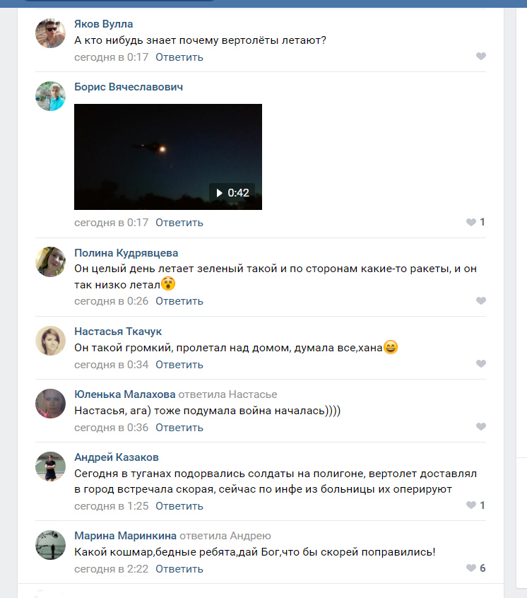 В одной из местных групп социальной сети «Вконтакте» пользователи пишут, что вертолет, возможно, доставлял пострадавших военных.