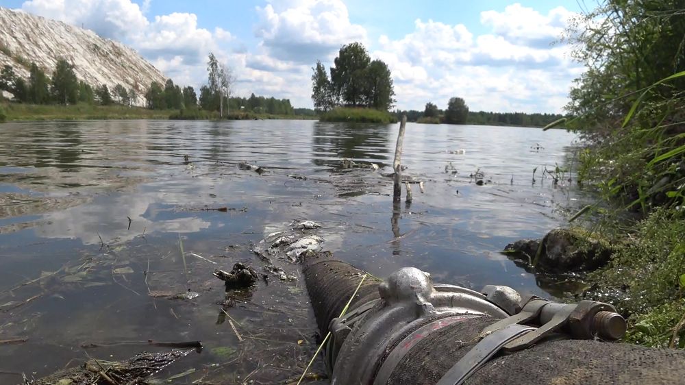 В Кингисеппском районе Ленинградской области пожарные тушат горящую свалку бытовых отходов. На месте работают бульдозеры и грузовики.