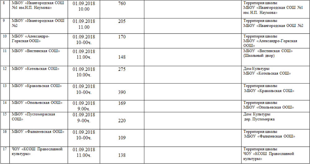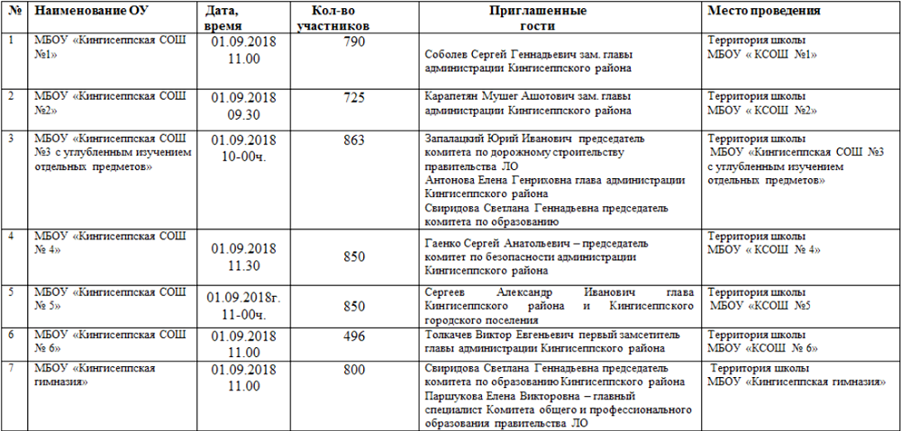 График торжественных линеек 1 сентября 2018 года в Кингисеппском районе