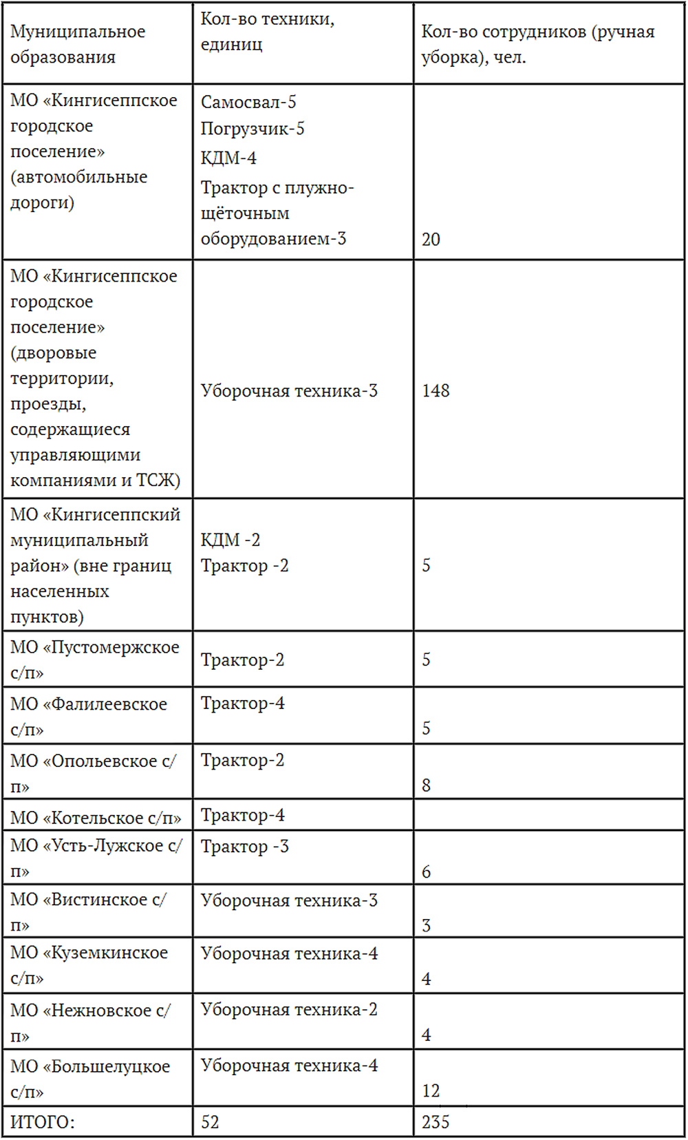Количество техники по уборке автомобильных дорог общего пользования местного значения на территории МО «Кингисеппский муниципальный район» за 05 февраля 2019 года.