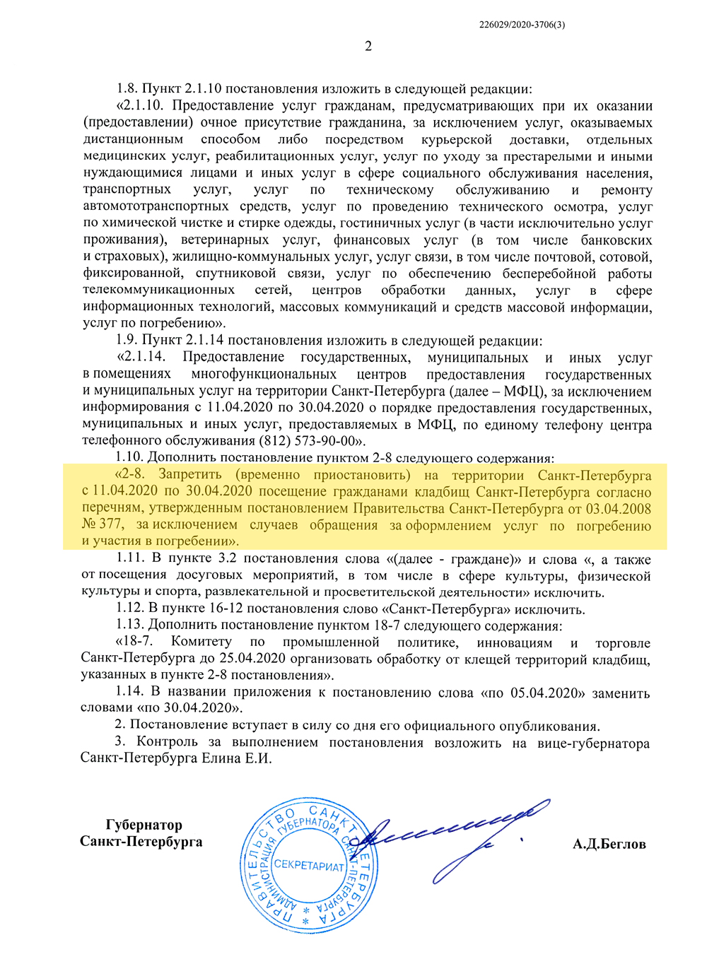 «Запретить (временно приостановить) на территории Санкт-Петербурга по 30.04.2020 с 11.04.2020 посещение гражданами кладбищ... за исключением случаев обращения за оформлением услуг по погребению и участия в погребении», - говорится в документе на сайте Смольного.