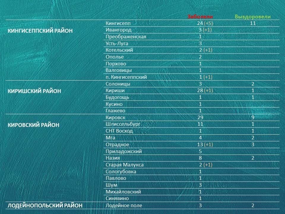Новые случаи выявлены: Кингисепп (+5), Ивангород (+1), п. Котельский (+1), п. Кингисеппский (+1).