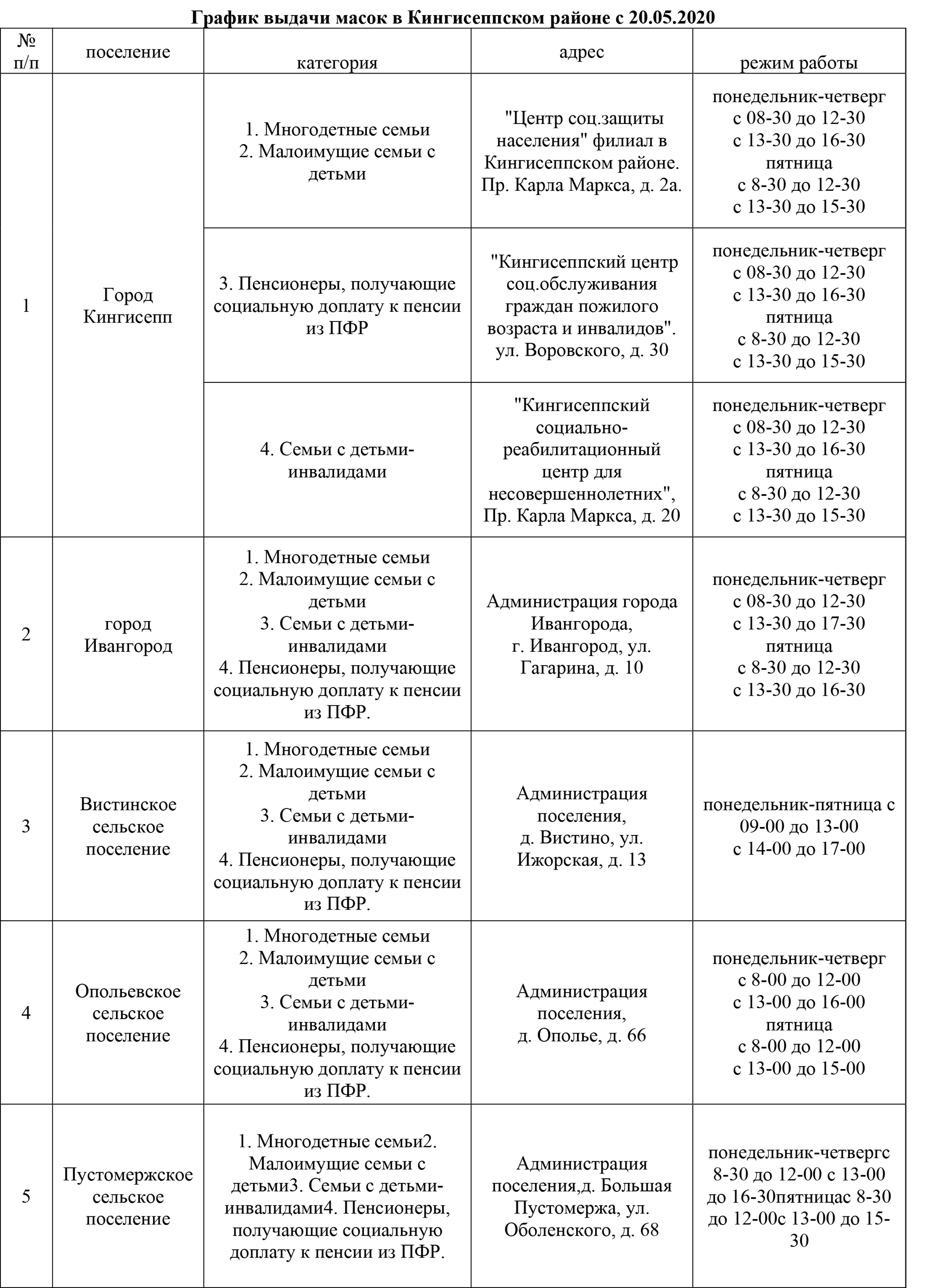 График выдачи масок в Кингисеппском районе с 20.05.2020