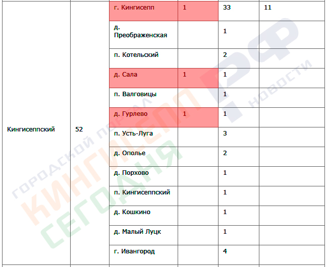 В Кингисеппском районе выявлено 3 заболеваяния. Помимо единичного случая в городе Кингисеппе, covid-19 выявлен в деревнях Сала и Гурлево.