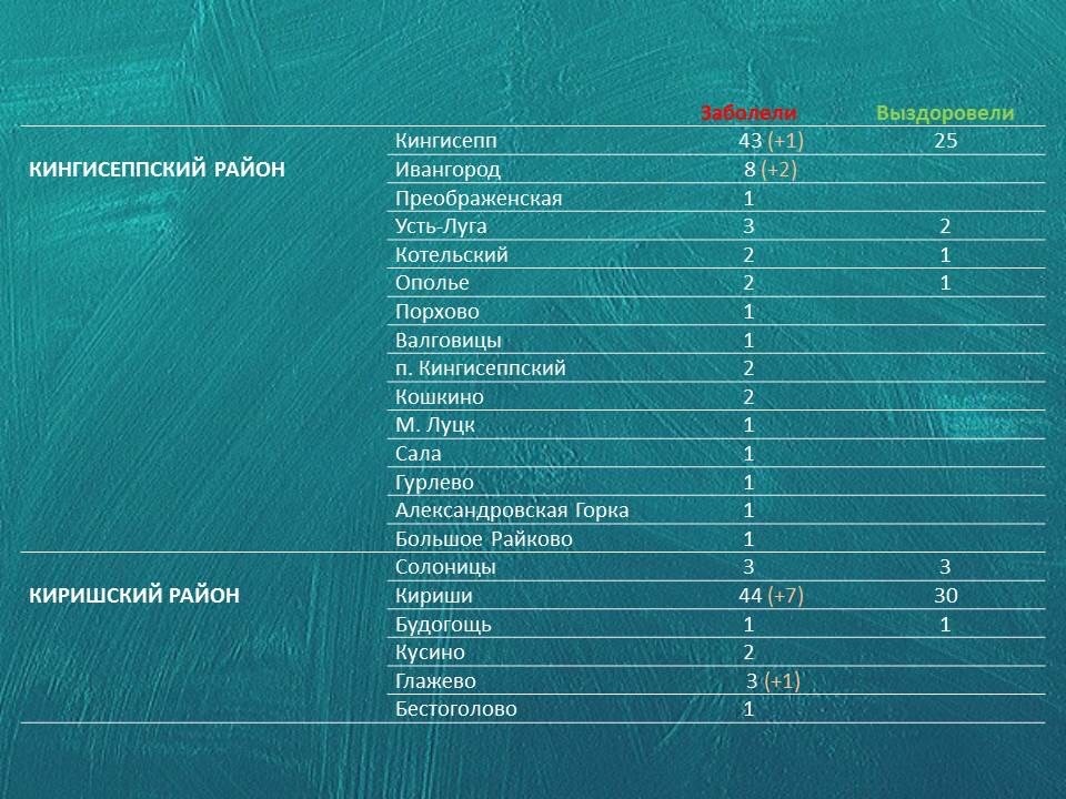 54 новых случая заражения коронавирусом были зафиксированы в 14 районах Ленинградской области.