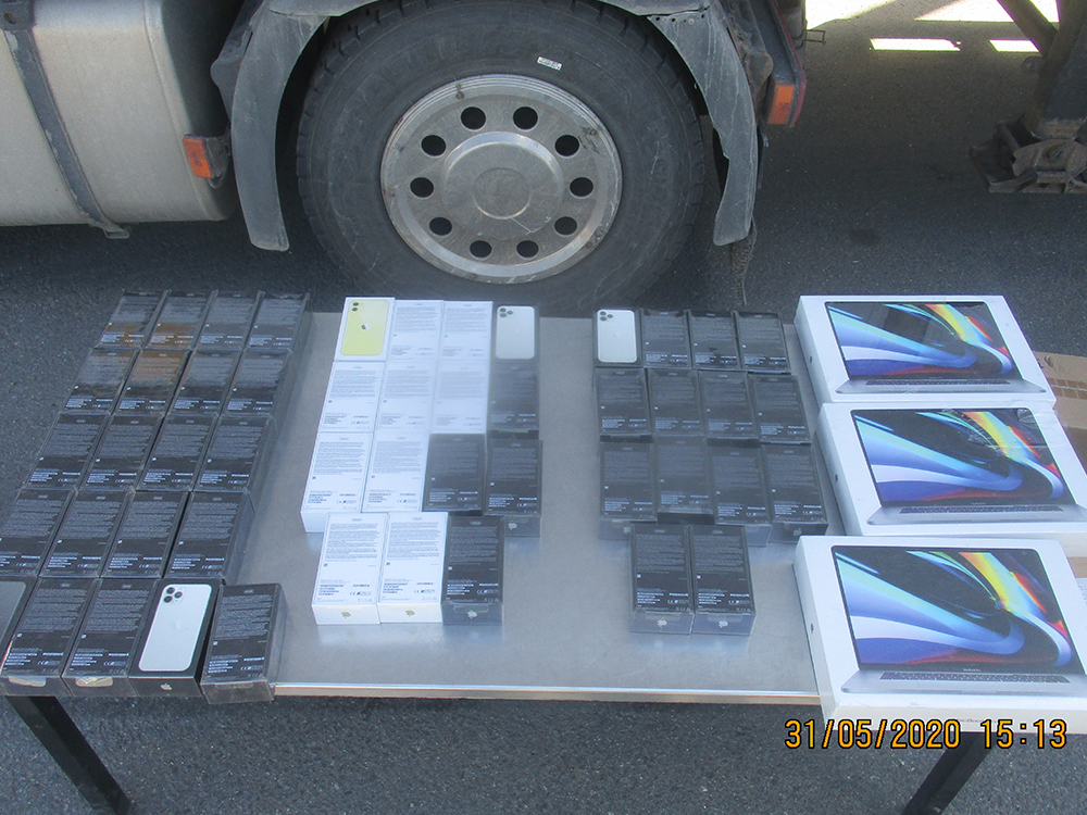 В ходе проведения совместного с представителями пограничной службы таможенного контроля, таможенники в кабине тягача и кузове обнаружили 50 новых мобильных телефонов и 3 новых ноутбука фирмы Apple общим весом 34 килограмма.