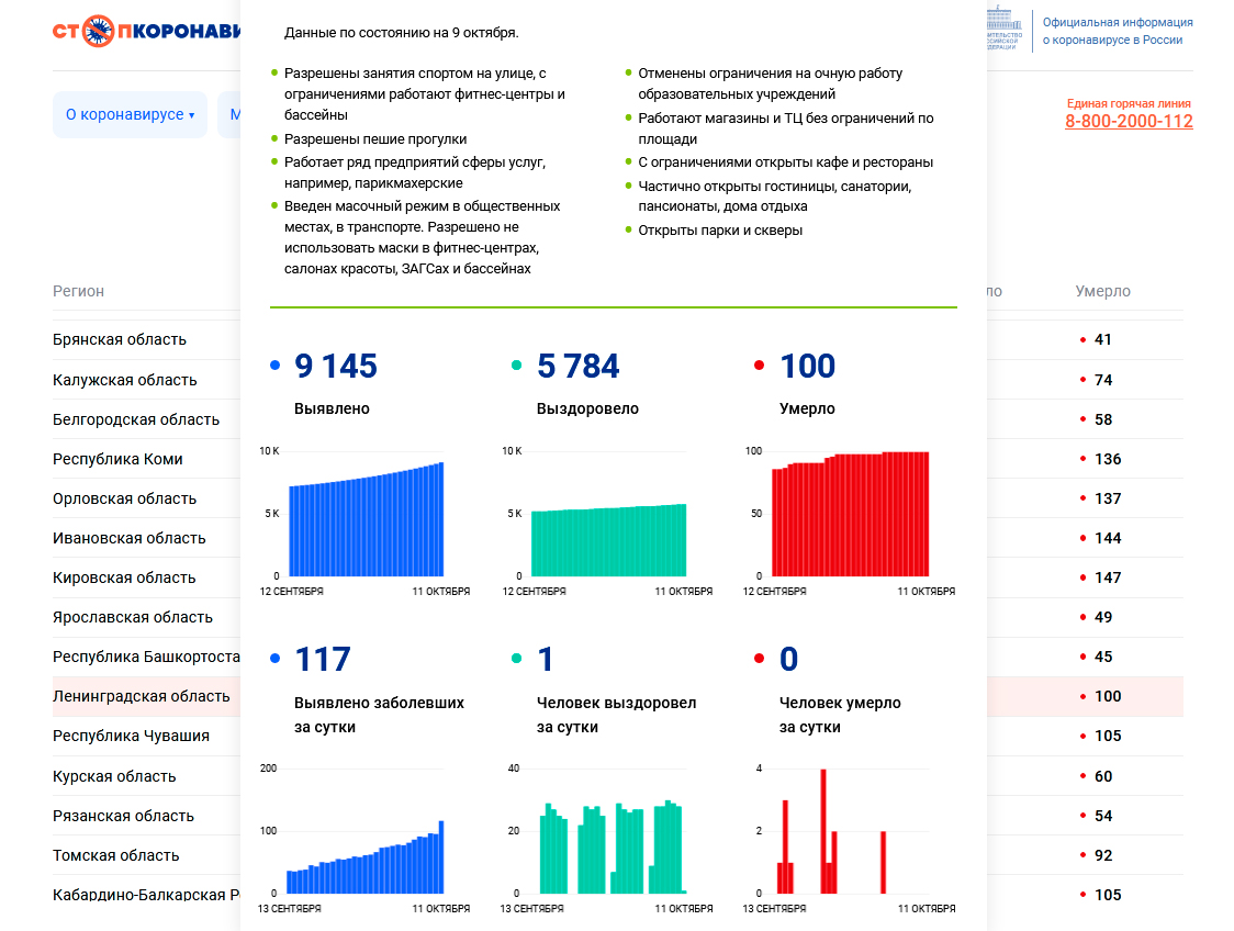 В Ленинградской области за сутки выявили 117 случаев COVID-19. Всего заболевших 9145, выздоровело 5785, умерло 100 человек.