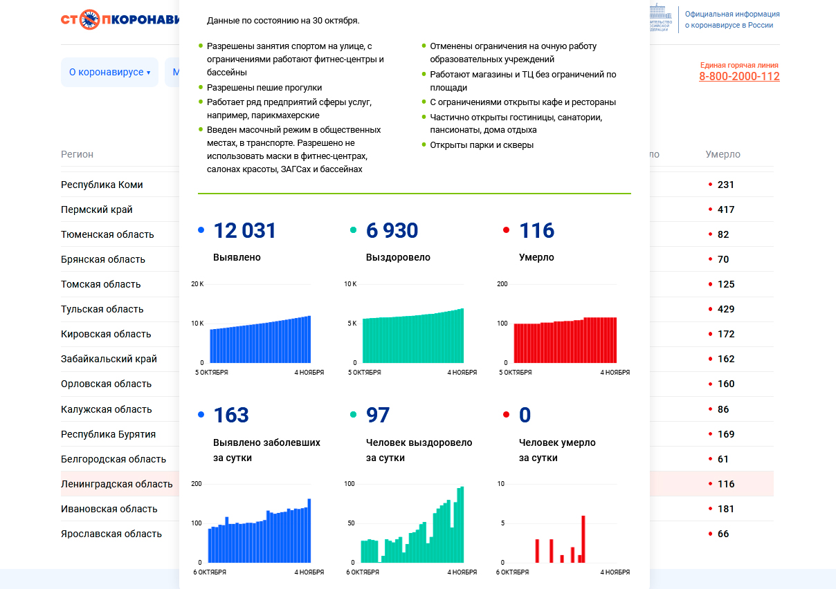 В Ленинградской области за сутки выявлено 163 заболевших. Всего за весь период в области зафиксировано 12 031 случай коронавирусной инфекции, 6 930 выздоровело и 116 человек умерло.
