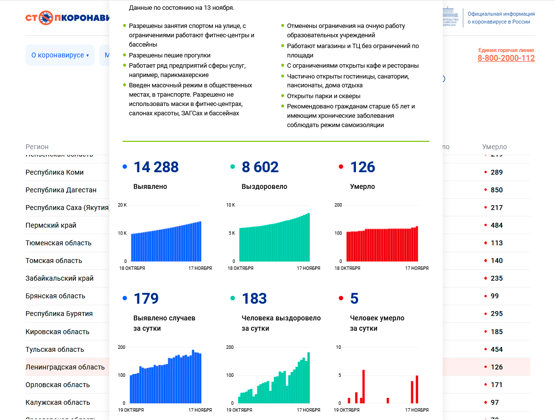 В Ленинградской области за последние сутки выявили 179 случаев COVID-19. За весь период в области зафиксировано 14 288 заболевших, 8 602 выздоровело и 126 человек умерло.