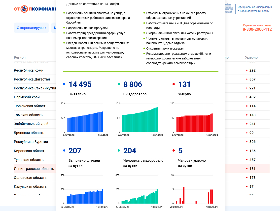 В Ленинградской области за последние сутки выявили 207 случаев COVID-19. За весь период в области зафиксировано 14 495 заболевших, 8 806 выздоровело и 131 человек умер.