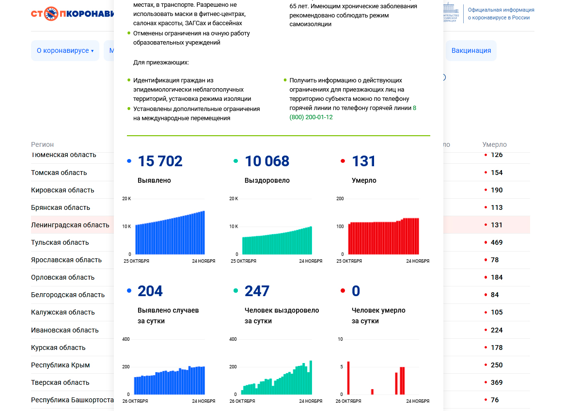 В Ленинградской области за последние сутки выявили 204 случая COVID-19. За весь период в области зафиксировано 15 702 заболевших, 10 068 выздоровело и 131 человек умер.