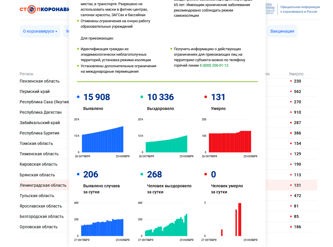 В Ленинградской области за последние сутки выявили 206 случаев COVID-19. За весь период в области зафиксировано 15 908 заболевших, 10 336 выздоровело и 131 человек умер.