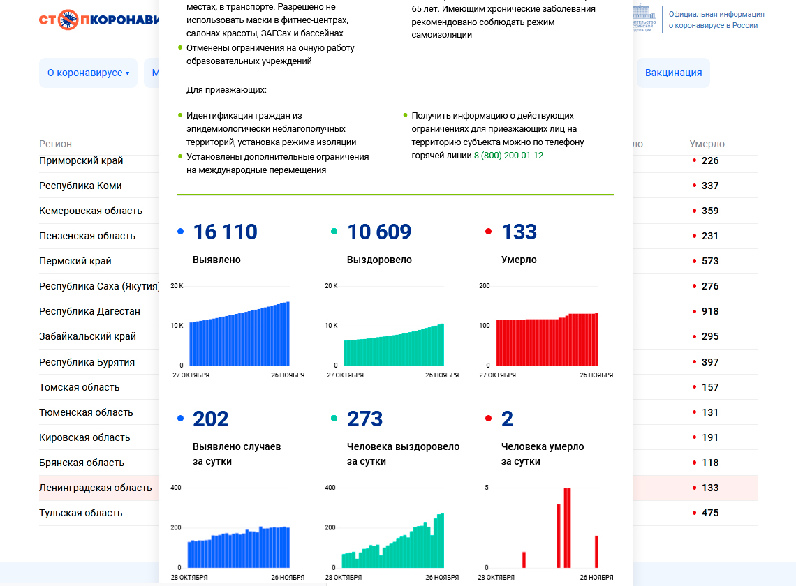 В Ленинградской области за последние сутки выявили 202 случая COVID-19. За весь период в области зафиксировано 16 110 заболевших, 10 609 выздоровело и 133 человека умерло.