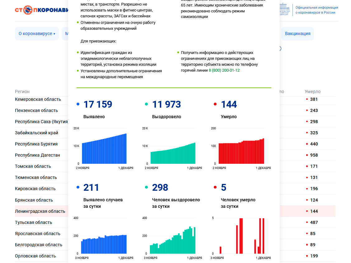 Оперштаб озвучил статистику: В Ленобласти за сутки выявили 211 случаев COVID-19, выздоровело 298 человек