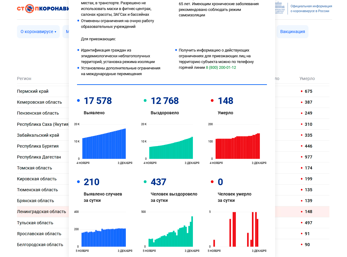 В Ленинградской области за последние сутки выявили 210 случаев COVID-19, 437 человек выздоровело. За весь период в области зафиксировано 17 578 заболевших, 12 768 выздоровел и 148 человек умерло.