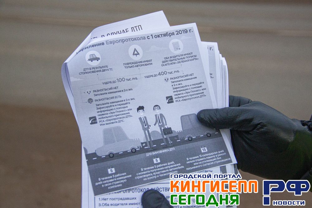 На территории Кингисеппского района в период с 16 ноября по 20 декабря 2020 года проводится профилактическое мероприятие «ЕВРОПРОТОКОЛ», направленное на обучение водителей самостоятельному оформлению документов о дорожно-транспортном происшествии, профилактике заторовых ситуаций, вызванных фактом ДТП, а также сокращению времени оформления дорожно-транспортных происшествий.