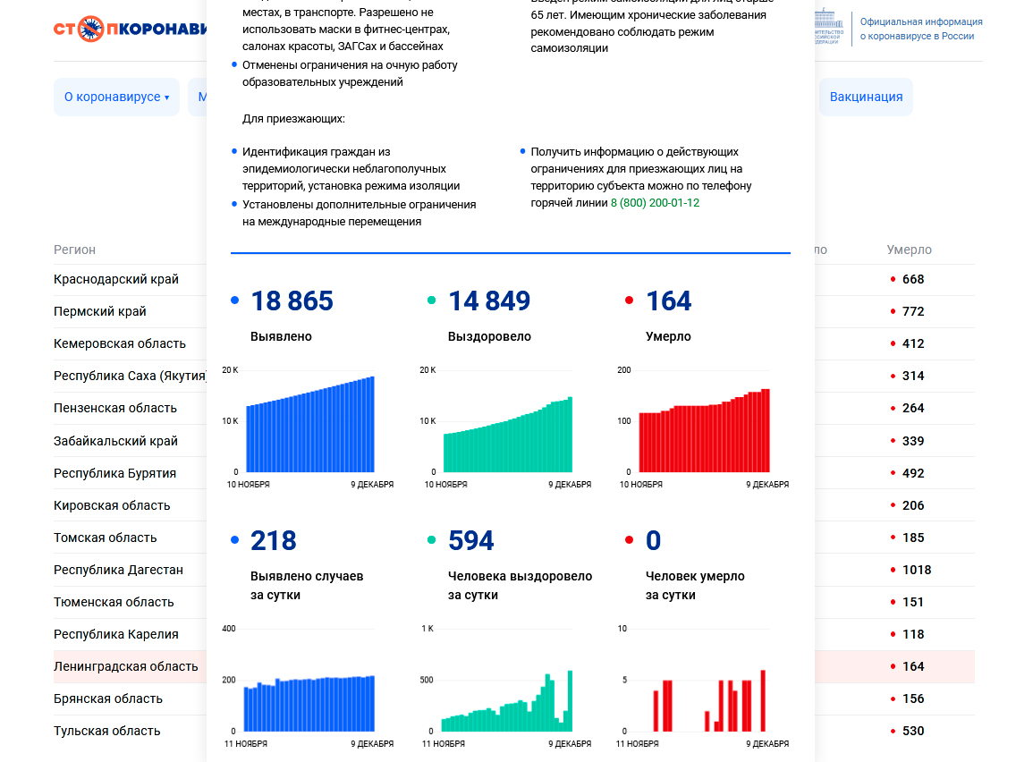 В Ленинградской области за последние сутки выявили 218 случаев COVID-19, 594 человека выздоровело. За весь период в области зафиксировано 18 865 заболевших, 14 849 выздоровело и 164 человек умерло.