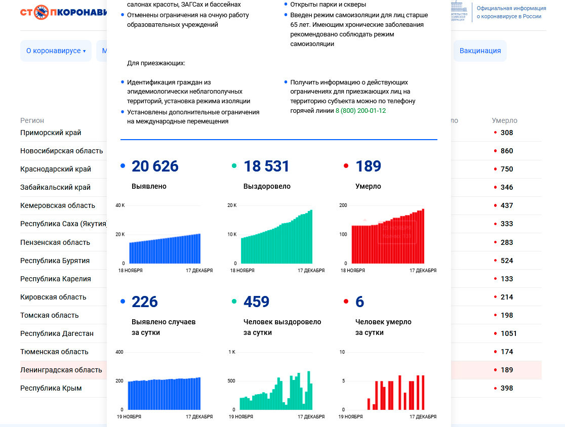 В Ленинградской области за последние сутки выявили 226 случае6в COVID-19, 459 человек выздоровело. За весь период в области зафиксировано 20 626 заболевших, 18 531 выздоровел и 189 человек умерло.