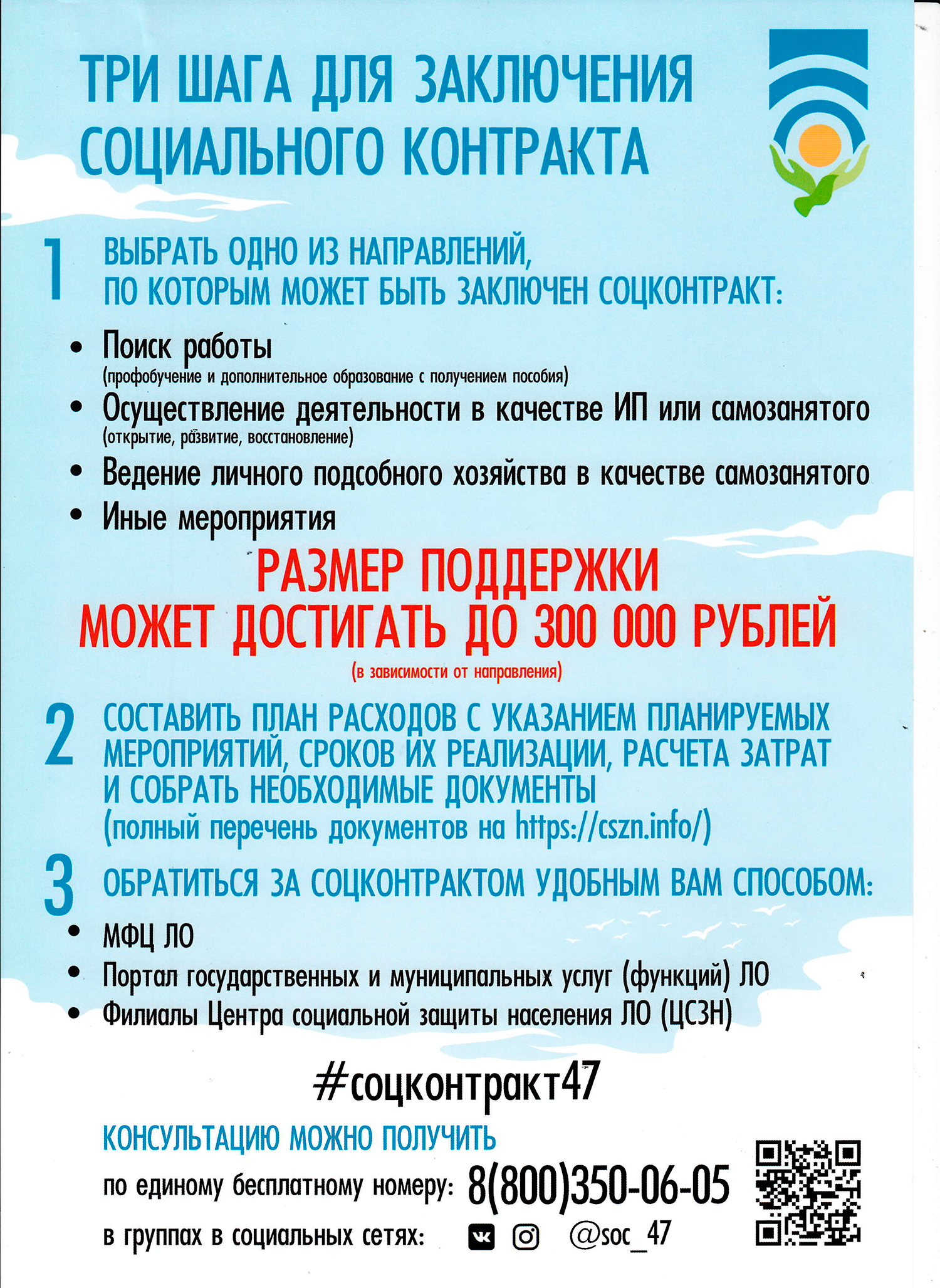 Социальный контракт – это взаимные обязательства в виде соглашения, заключенного между малоимущим гражданином, который обязуется реализовать мероприятия, предусмотренной программой социальной адаптации, и филиалом ЛОГКУ «Центр социальной защиты населения», который обязуется оказать гражданину государственную социальную помощь на основании социального контракта.