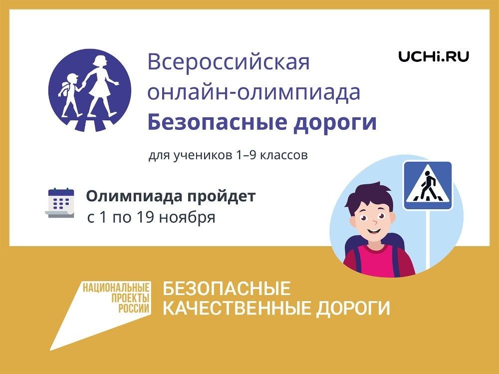 В целях профилактики детского дорожно-транспортного травматизма, а также в рамках национального проекта «Безопасные и качественные дороги», АНО «Национальные проекты» совместно с МВД России, Минтрансом России и Минпросвещения России проводит Всероссийскую онлайн-олимпиаду для обучающихся 1-9 классов общеобразовательных организаций на знание основ безопасного поведения на дорогах. Указанная олимпиада пройдет на образовательной платформе Учи.ру с 1 по 19 ноября 2021 года.