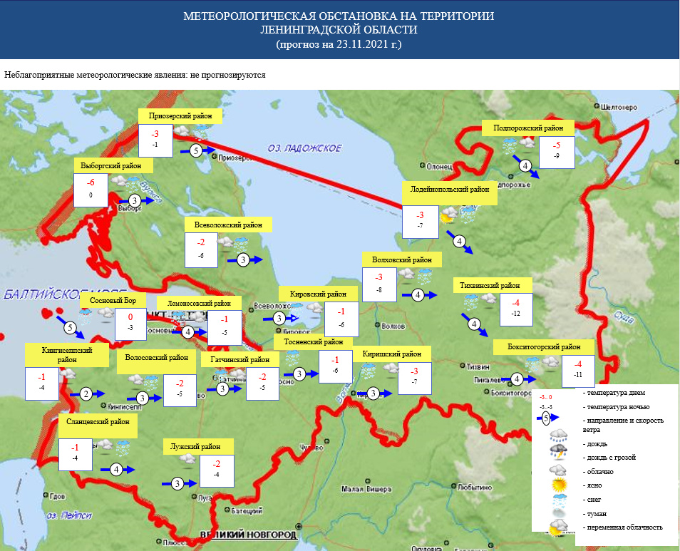 Во вторник, 23 ноября, в 47 регионе ожидается облачная с прояснениями и небольшим снегопадом погода. Ночной западный и юго-западный ветер силой в 2-7 м/с сменится на дневной юго-западный и южный 4-9 м/с. Температура воздуха в темное время суток будет варьироваться на западе (Сланцевский, Кингисеппский, Волосовский районы и т.д.) от -2 до -7, на востоке (Лодейнопольский, Подпорожский районы и т.д.) от -8 до -13.