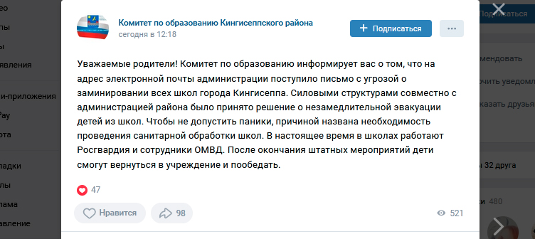 Уважаемые родители! Комитет по образованию информирует вас о том, что на адрес электронной почты администрации поступило письмо с угрозой о заминировании всех школ города Кингисеппа. Силовыми структурами совместно с администрацией района было принято решение о незамедлительной эвакуации детей из школ. Чтобы не допустить паники, причиной названа необходимость проведения санитарной обработки школ. В настоящее время в школах работают Росгвардия и сотрудники ОМВД. После окончания штатных мероприятий дети смогут вернуться в учреждение и пообедать.
