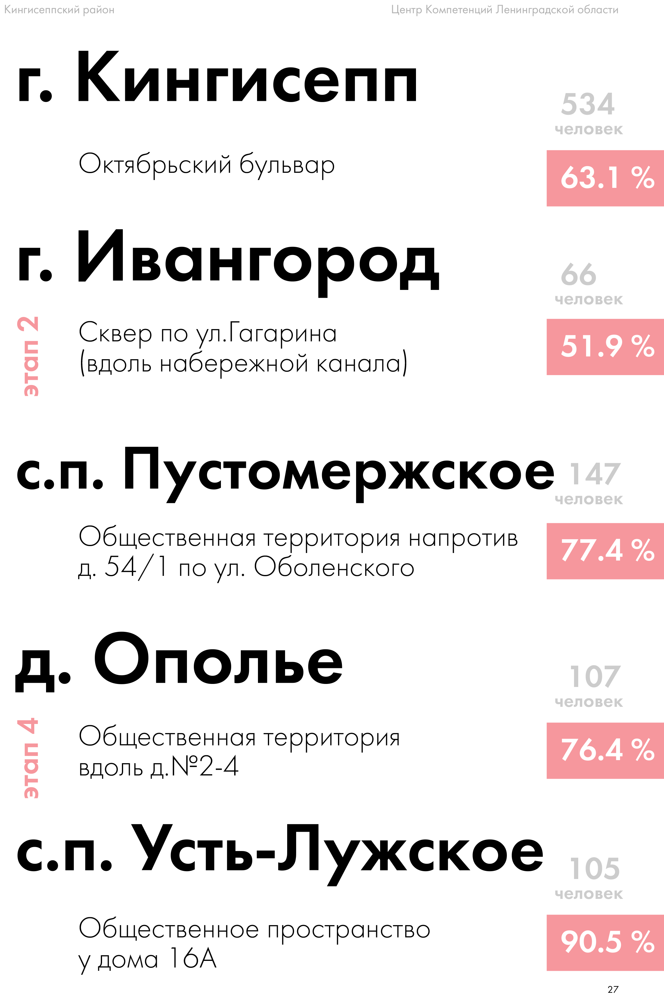 «Всего в голосовании приняли участие 76 596 жителей. Самыми активными стали респонденты из Гатчинского, Всеволожского, Волховского, Ломоносовского районов и Соснового Бора. Победившие парки, скверы, набережные, многофункциональные спортивные и детские пространства ждет подготовка дизайн-проектов с учетом пожеланий жителей, участие в отборе на включение в программу и выделение средств на реализацию», ― пояснил председатель комитета по ЖКХ Ленинградской области Александр Тимков.