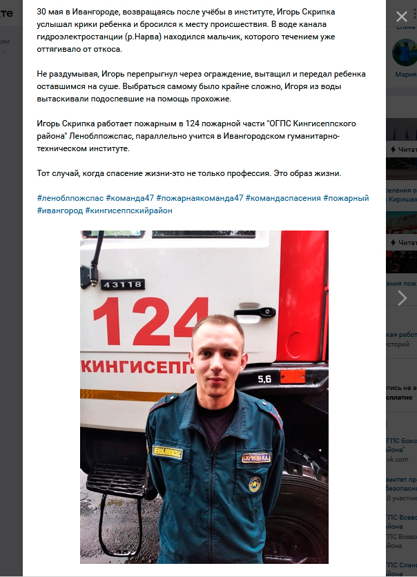 Игорь Скрипка работает пожарным в 124 пожарной части "ОГПС Кингисеппского района" Леноблпожспас, параллельно учится в Ивангородском гуманитарно-техническом институте.