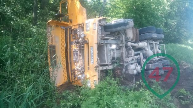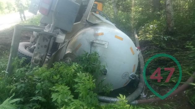 ДТП произошло утром 13 июня на трассе "Нарва" у деревни Лужицы. КамАз с цистерной вылетел в кювет и завалился на бок. По словам очевидцев, водитель выбрался самостоятельно, а в цистерне предположительно стоки из септика.