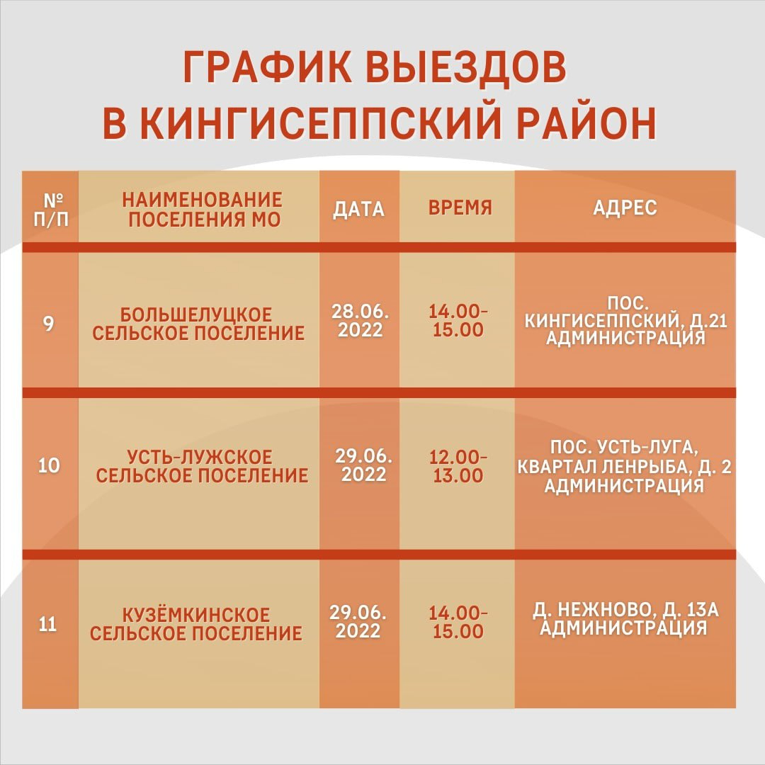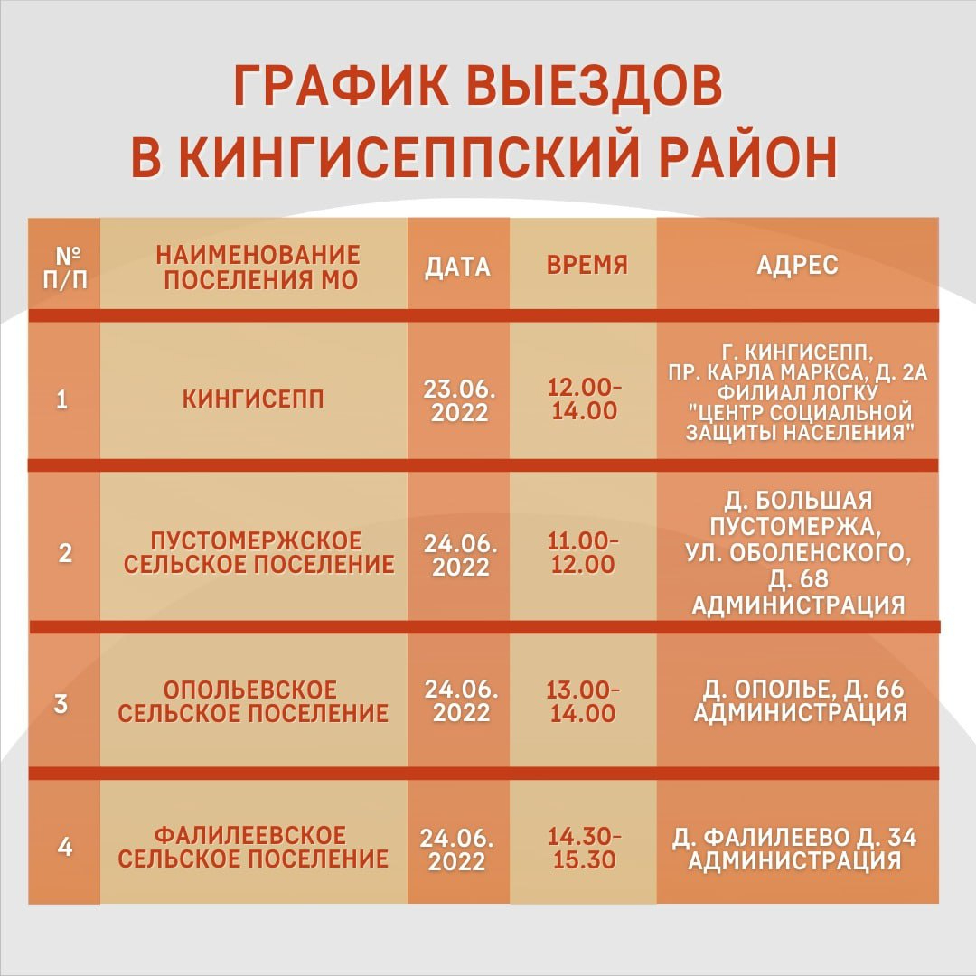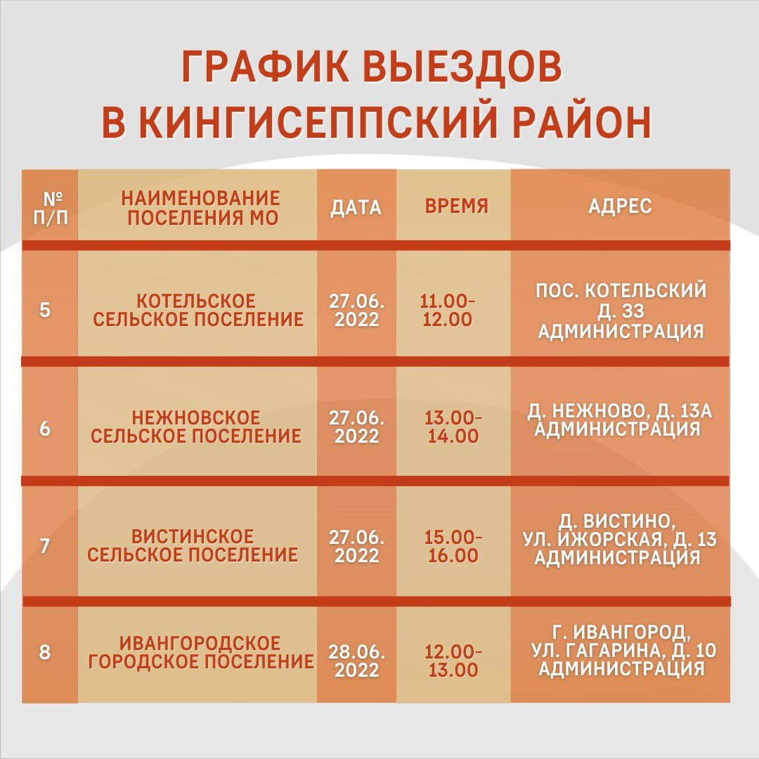23 июня сотрудники регионального комитета ответят на вопросы жителей Кингисеппа, а на следующий день приедут в Большую Пустомержу, Ополье и Фалилеево. 27 июня запланирован прием жителей поселка Котельский и деревень Вистино и Нежново. 28 июня мобильная приемная будет работать в Ивангороде и поселке Кингисеппский.
