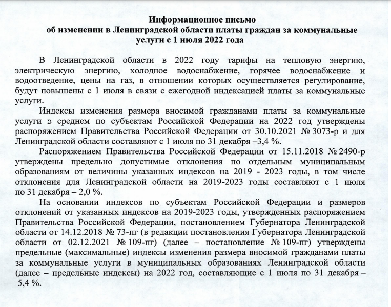 На основании индексов по субъектов РФ и размеров отклонений от указанных индексов на 2019-23 гг, утвержденных распоряжением Правительства РФ, постановлением губернатора Ленинградской области от 14.ё1.2018 №73-пг утверждены предельные индексы изменения размера вносимой гражданами платы за коммунальные услуги в муниципальных образованиях Ленинградской области на 2022 год, составляющие с 1 июля по 31 декабря - 5,4%.