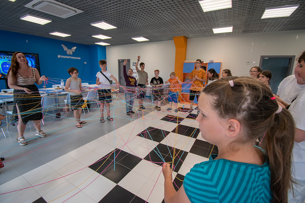 Завершился вечер «шерстяным тимбилдингом». Ребята с восторгом кидали друг другу моток ниток, часть верёвочки оставляя себе. В конечном итоге получилась большая разноцветная паутина. Всем было весело и интересно, а самое главное, все увидели, что дружная работа в команде является важным аспектом в любом начинании.