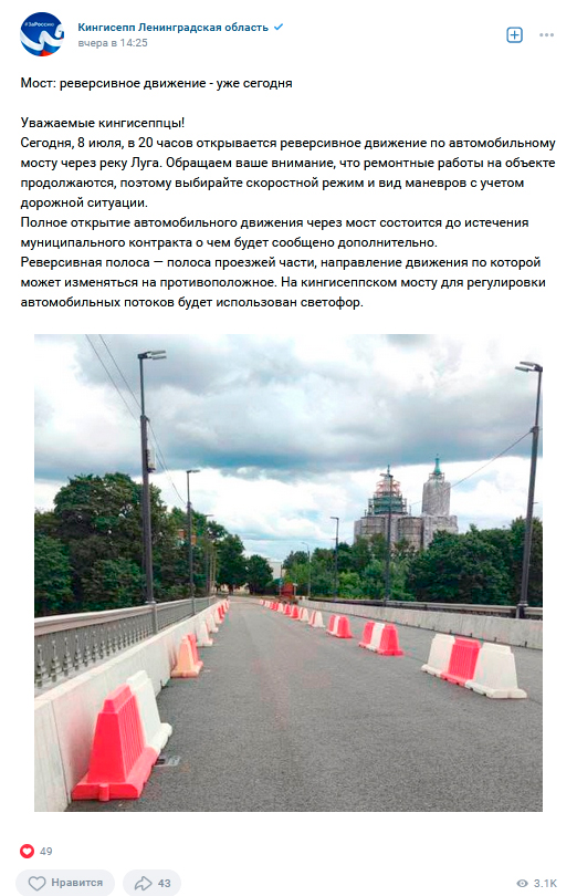 8 июля вечером открылось реверсивное движение по автомобильному мосту через реку Луга, сообщает администрация Кингисеппского района.