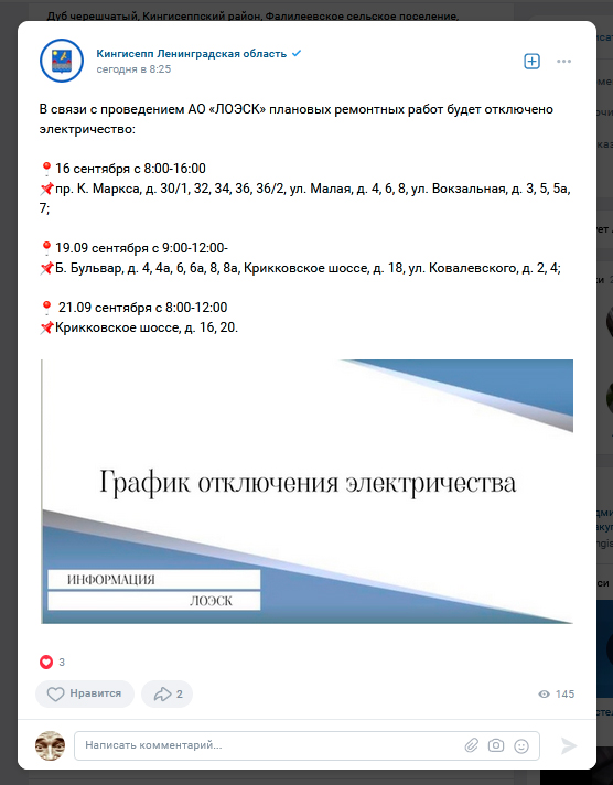 В связи с проведением АО «ЛОЭСК» плановых ремонтных работ в Кингисеппе будет отключено электричество, сообщает администрация Кингисеппского района.