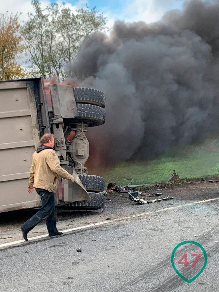 Как рассказали 47news с места аварии, есть версия, что грузовик был подрезан легковым автомобилем после чего врезался в автобус. Очевидцы достали водителя автобуса, застрявшего за рулём.