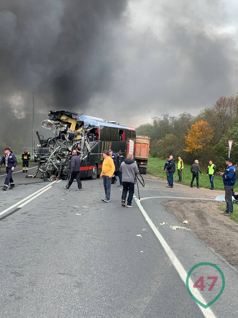 По предварительным данным, ДТП произошло в половине второго часа дня 10 октября на 106 километре трассы "Нарва" в районе деревни Гурлево. Лоб в лоб столкнулись КамаЗ и пассажирский автобус с маркировкой перевозчика LuxExpress. Грузовик опрокинулся на бок и загорелся. В автобусе находилось 16 человек, в том числе двое водителей.