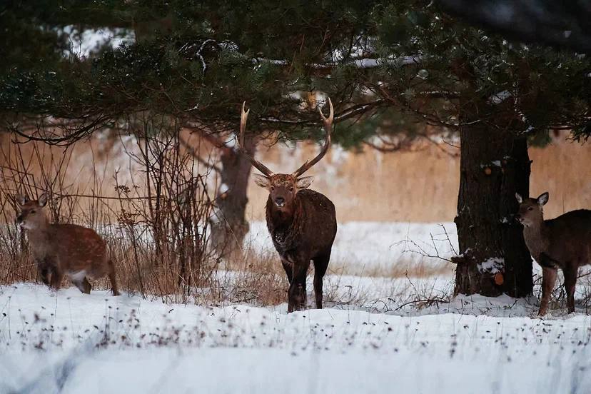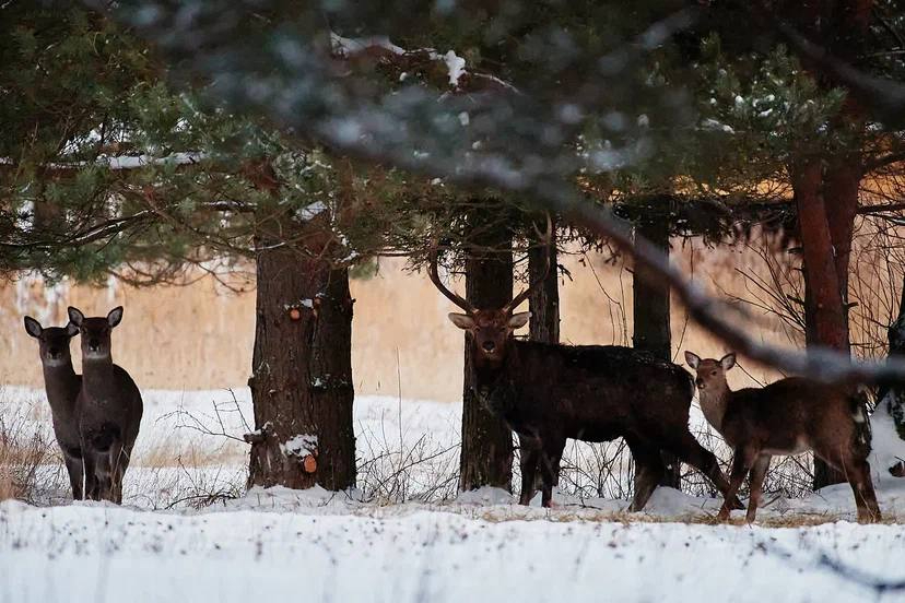 На снимках - самец с роскошными рогами, а также самка и потомство. "Судя по упитанности - олени не голодают. В заказнике идёт только одна охота - за браконьерами", - написал губернатор.