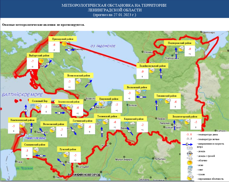 В пятницу, 27 января, в Ленинградской области по прогнозам ожидается облачная с прояснениями погода. В ранние часы суток возможны снегопады.