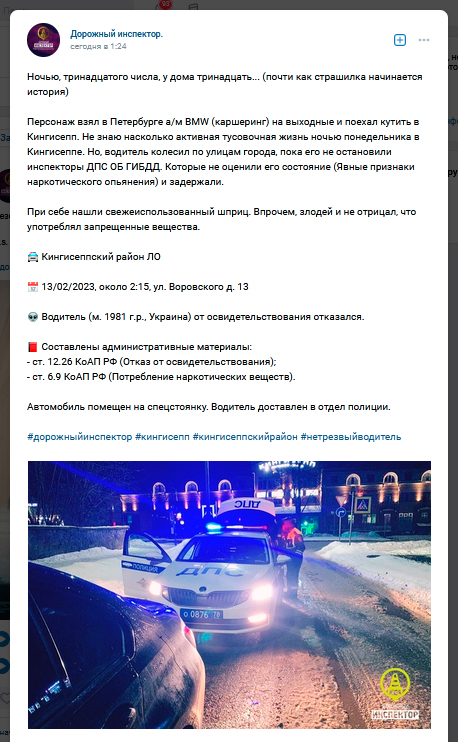 Водитель каршеринга, который сел за руль в состоянии наркотического опьянения, был задержан в Кингисеппе, сообщает "Петербургский дневник" со ссылкой на паблик «Дорожный инспектор».
