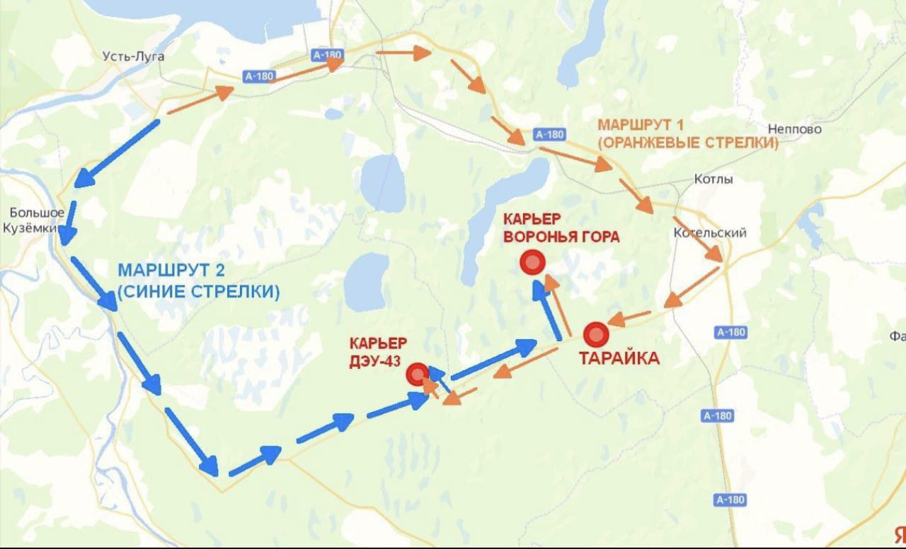 Синим цветом выделен участок трассы "Кингисепп — Краколье". По нему действительно первое время шло движение грузовиков, но дорога быстро пришла в плачевное состояние. Дорожники начали частичный ремонт на самом разбитом участке и порой вводили реверсивное движение. Перевозчикам стало неудобно, они пошли по пути наименьшего сопротивления и переориентировались на Тарайку.