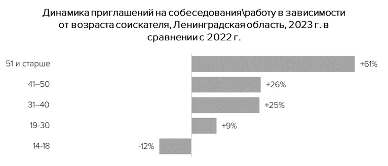 Стоит отметить, чаще всего ленинградские компании заинтересованы в молодых специалистах. Так, например, приглашения на собеседования преимущественно получают кандидаты в возрасте от 19 до 30 лет. Кроме того, спросом пользуются работники в возрасте от 31 года до 40 лет, а также от 41 года до 50 лет.