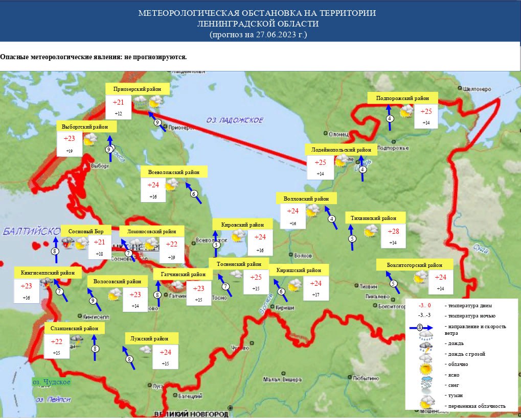 О метеорологической обстановке на 27 июня сообщает пресс-служба ГУ МЧС России по Ленобласти.