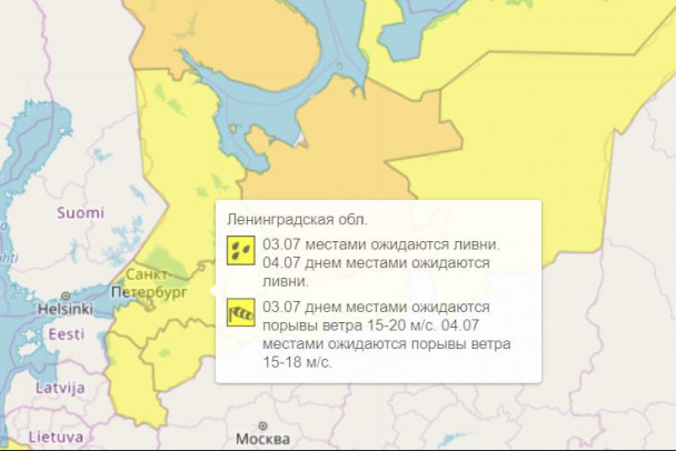 По данным Гидрометцентра России, в понедельник и вторник, 3 и 4 июля, в Ленинградской области ожидаются дожди и ливни, объявлен желтый уровень погодной опасности.