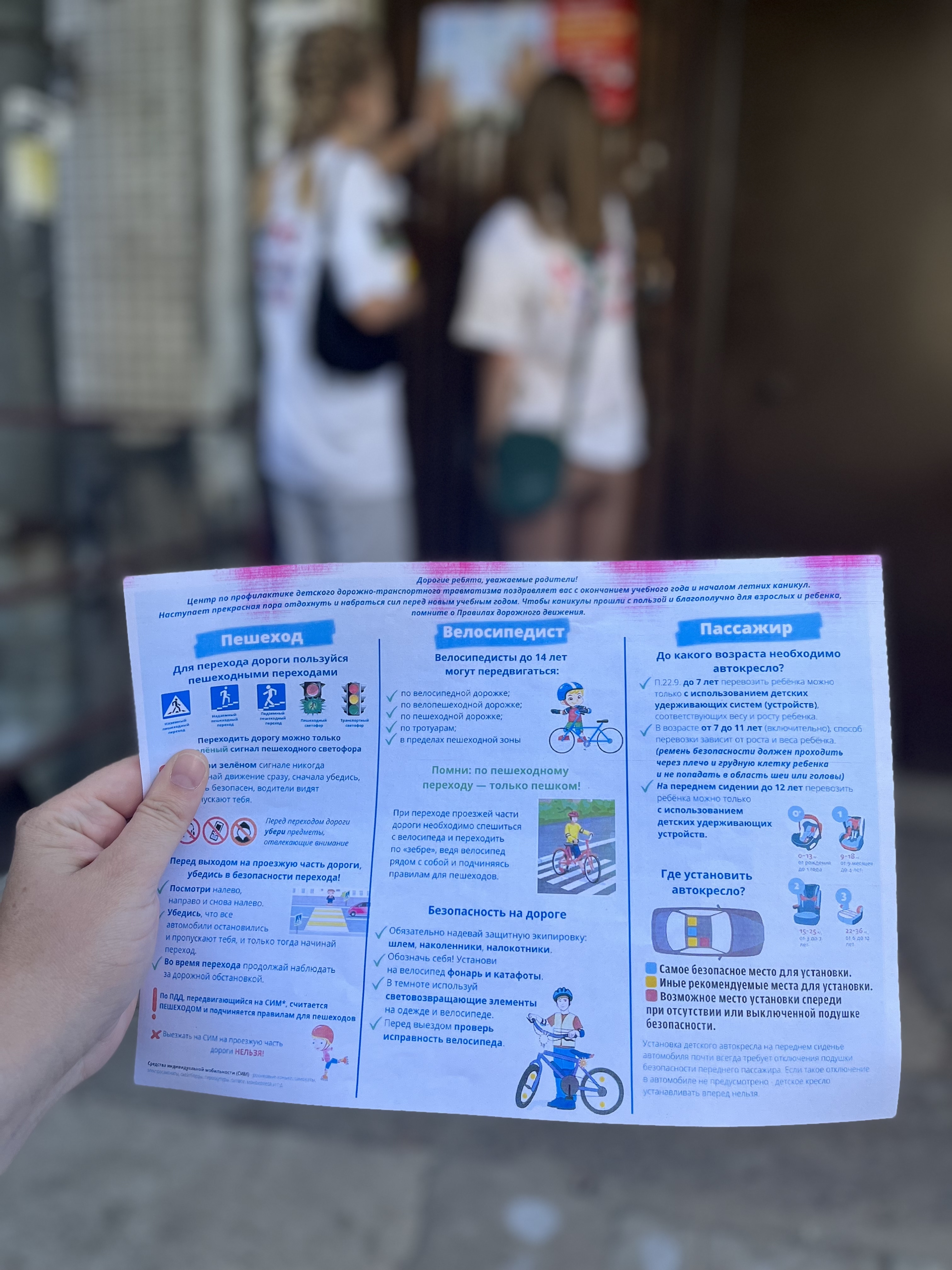 На информационных стендах многоквартирных домов волонтеры расклеили информационные памятки для пешеходов, велосипедистов, а также информация о детских удерживающих устройствах и средствах индивидуальной мобильности.