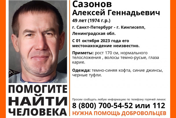 Организованы поиски 49-летнего Сазонова Алексея. Мужчина пропал 1 октября. Он может находиться в Петербурге или Кингисеппе.