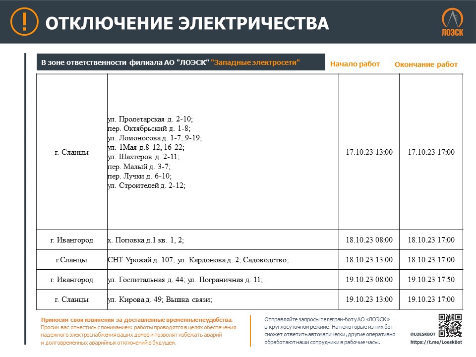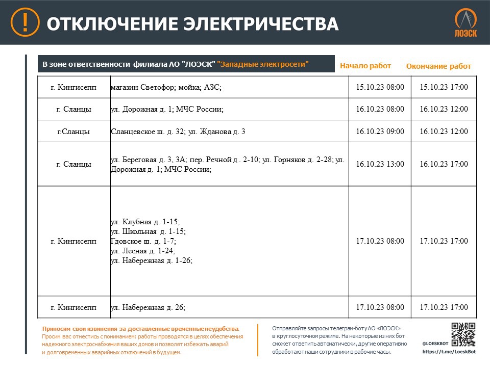 Ниже график плановых отключений со 16 по 22 октября в Кингисеппском районе и Сланцевском районах.