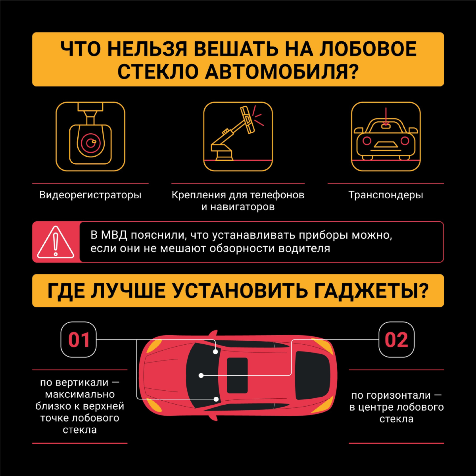 Как показано на инфографике, на лобовом стекле нельзя размещать видеорегистраторы, крепления для телефонов и навигаторов и транспондеры. При этом сотрудники МВД поясняют, что устанавливать сами приборы необходимо так, что они не мешали обзору.